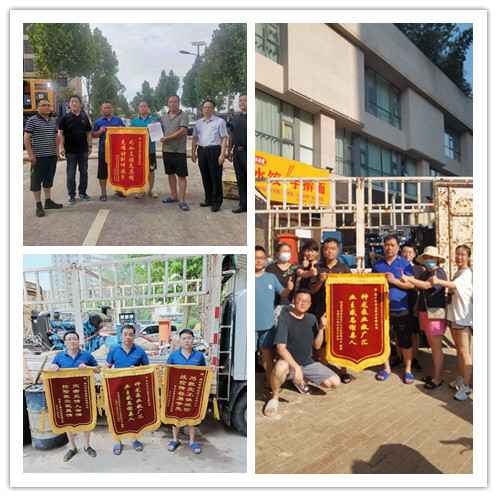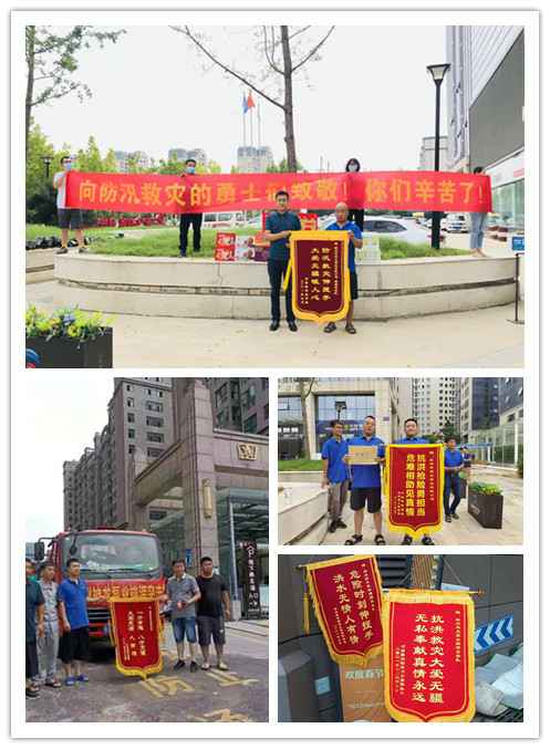 扬州俊琛绿色新能源有限公司自7月21日以来,在郑州各个小区组织地下室排水工作24小时不间断轮班制的深水里进行排水作业,各被救援小区居民争相制作锦旗感谢神龙排涝突击队。
